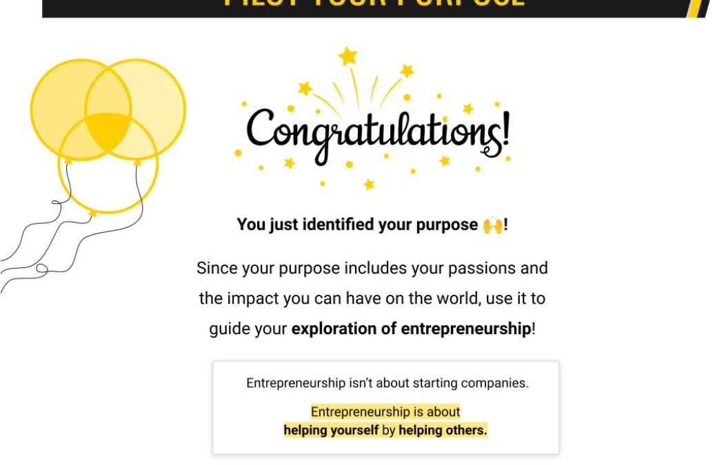 An image with the header “Pilot Your Purpose” and festive balloons. The main text reads, “Congratulations! You just identified your purpose 🙌! Since your purpose includes your passions and the impact you can have on the world, use it to guide your exploration of entrepreneurship!” Below is a quote: “Entrepreneurship isn’t about starting companies. It’s about helping yourself help others.” The footer notes