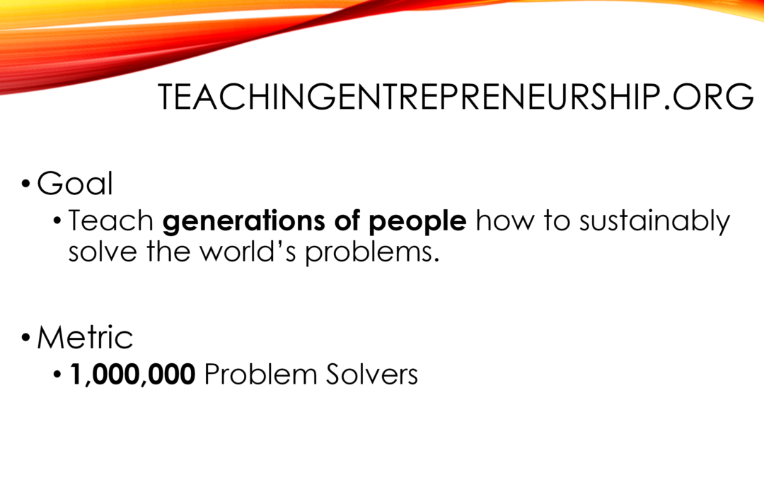 Goal: Teach generations of people how to sustainably solve the world's problems. Metric: 1,000,000 problem solvers